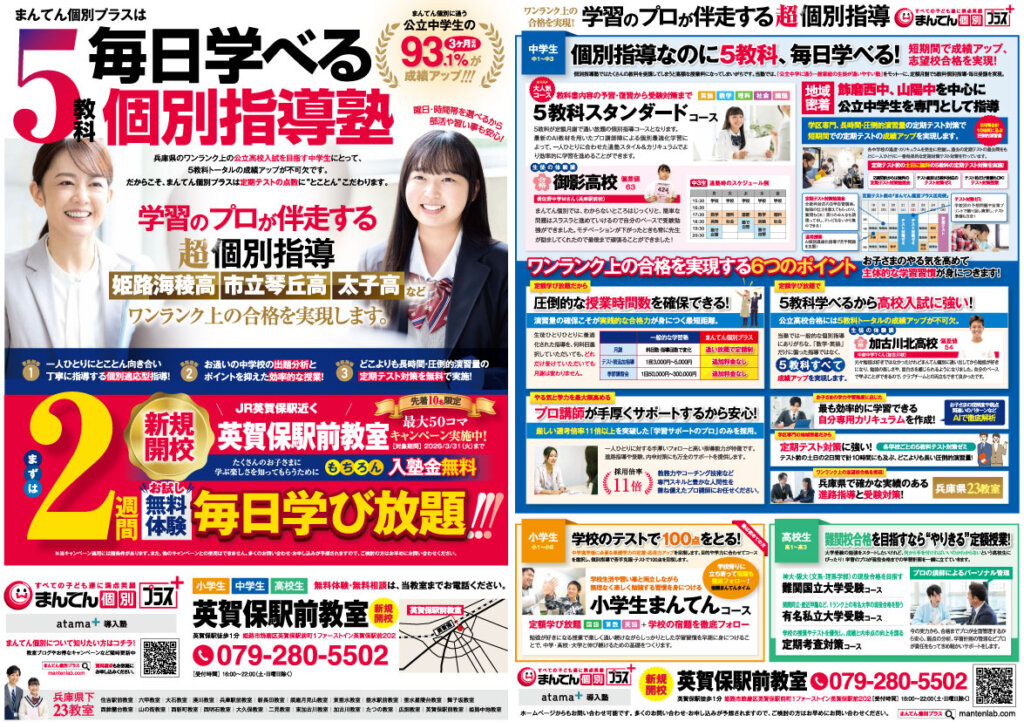 【毎日通える個別指導】のまんてん個別は、毎日個別指導・圧倒的な勉強量で短期間で成績アップを実現いたします。