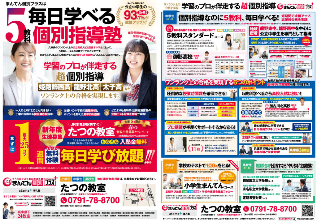 春の新規生徒募集キャンペーン!最大1週間学び放題!最大25コマ無料! - 兵庫県の個別学習塾【まんてん個別指導塾】