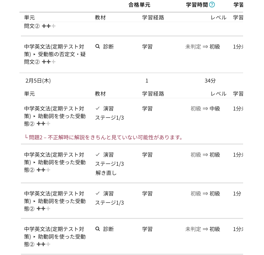 学習の「質」が変わったことで、演習の合格率も飛躍的に向上しました。受動態の否定文・疑問文に25分、助動詞の受動態に23分と、難易度の高い単元でも逃げずに合格を勝ち取る力がつきました。